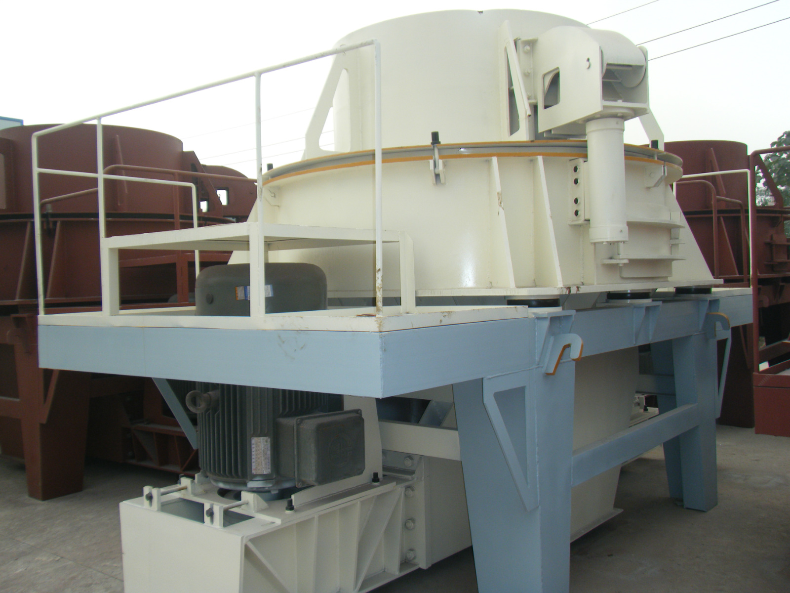 然后以60-70米/秒的速度从叶轮三个均布的流道内抛射出去,首先由分料器四周自收落下的一部分物料冲击破碎,然后一起冲击到涡支腔内物料衬层上,被物料